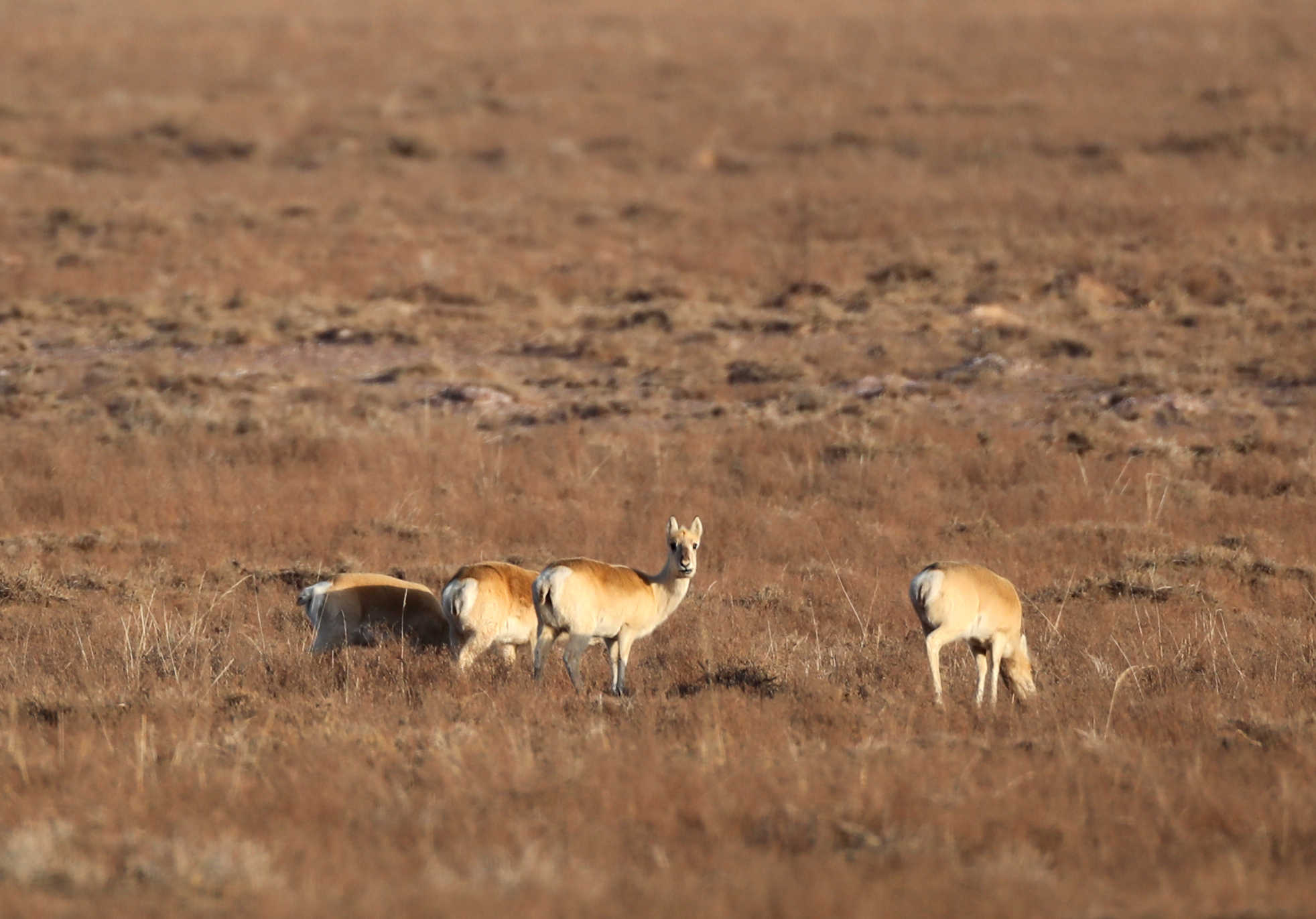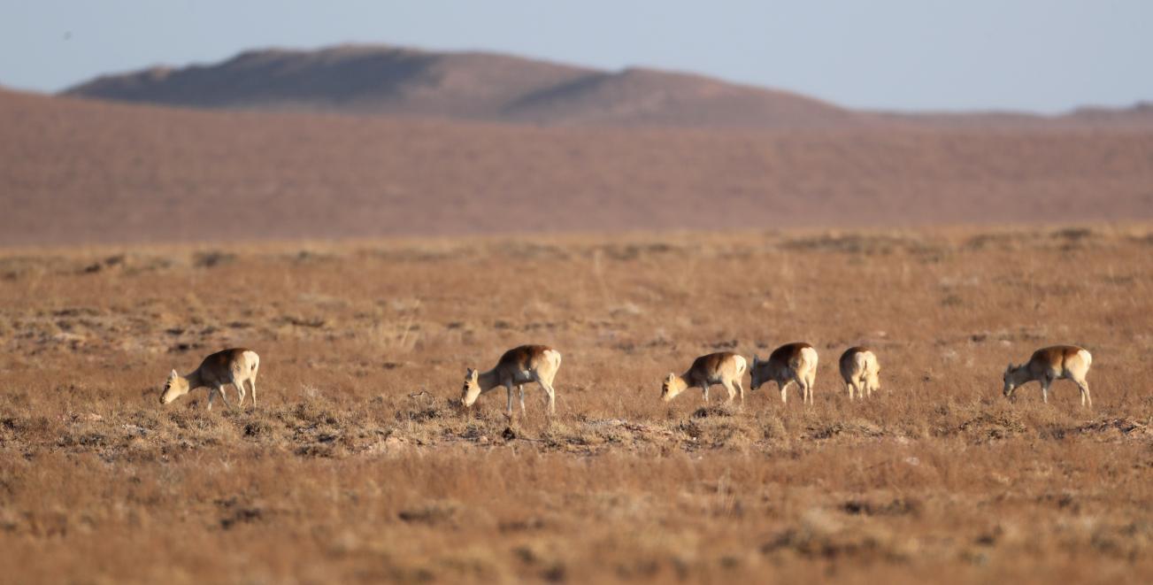 与秃鹫的高空活动形成鲜明对比的,是地面上集群觅食的蒙原羚。这群蒙原羚毛色呈典型的冬季浅红棕色,臀部的白色斑块清晰可见,其中既有成年个体矫健的身影,也有亚成体灵活穿梭的踪迹。蒙原羚又名蒙古原羚,是典型的草原有蹄类动物,体长可达1.6米,奔跑速度最快可达90公里/小时,擅长跳跃,平地纵跳距离可达6-7米。它们以禾本科、豆科等草原植物为食,其种群数量的稳定增长,直接反映了草原植被的恢复成效与生态环境质量的提升。监测数据显示,此次发现的蒙原羚种群结构合理,活动状态活跃,充分体现了我市对草原生态的有效保护。